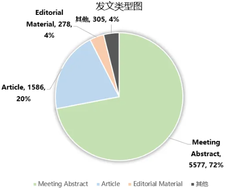 根据Web of Science收录论文(Article、Review、Letter)的统计,JOURNAL OF THE INTERNATIONAL AIDS SOCIETY从2004年至2024年11月,共收录7746篇。文章类型上,以Meeting Abstract为主,共5577篇,占比约71.998%;其次是Article类型,为1586篇,占比约为20.475%;Editorial Material类型的文章278篇,占比约为3.589%。