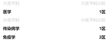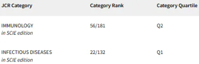JCR分区:在IMMUNOLOGY排第56名,位于Q2区;在INFECTIOUS DISEASES排第22名,位于Q1区。
