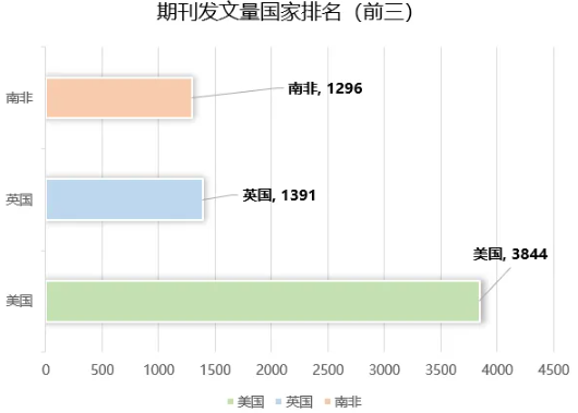 目前期刊总计发文量为7746篇,其中发文量最多的为美国学者,共3844篇,占比约49.626%;第二名是英国学者,共发文1391篇,占比约为17.958%;南非学者发文1296篇,发文量排名第三,占比约16.731%。
