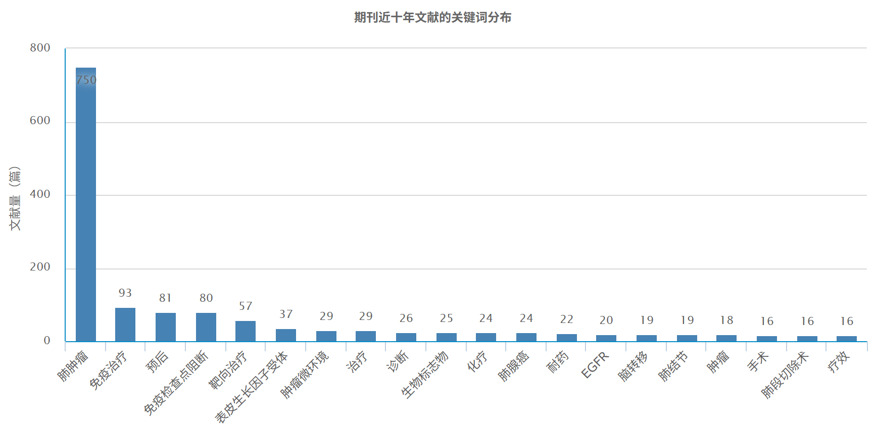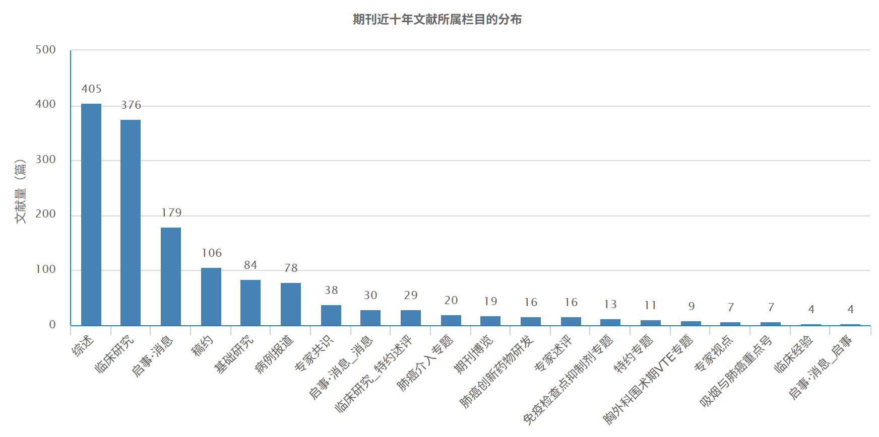 在该期刊中,"肺肿瘤"栏目的发文量最高,其次是"免疫治疗"、"预后"、"免疫检查点阻断"、"靶向治疗"等。