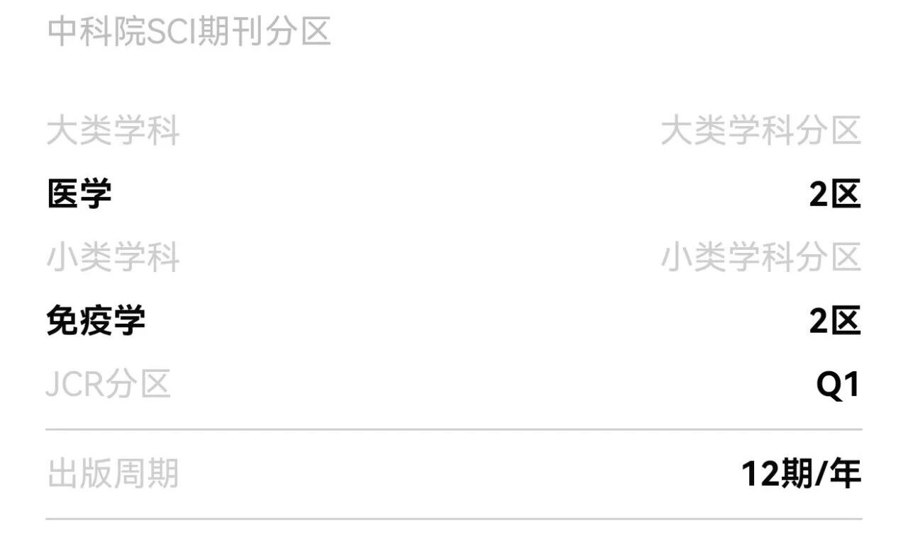 中科院大类分区:大类学科-医学2区;小类学科-免疫学2区。
