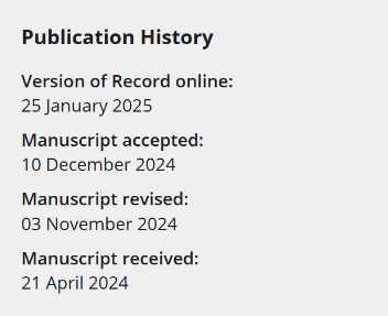 第二篇是2025年2月9日发表Research Article类型文章,从2024年7月7日收到稿件,2024年12月27日发录用通知,即从投稿到接收用时6个月左右,接收后1个多月后发表。