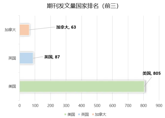目前期刊总计发文量为1020篇,其中发文量最多的为美国学者,共805篇,占比约78.922%;第二名是英国学者,共发文87篇,占比约为8.529%;加拿大学者发文63篇,发文量排名第三,占比约6.176%。