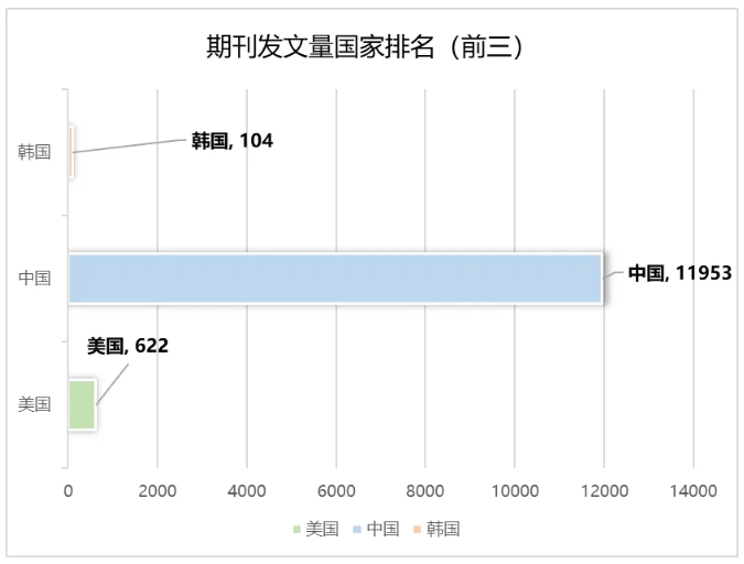 目前期刊总计发文量为12619篇,其中发文量最多的为中国学者,共11953篇,占比约94.722%;第二名是美国学者,共发文622篇,占比约4.929%;韩国学者发文104篇,发文量排名第三,占比约0.824%。