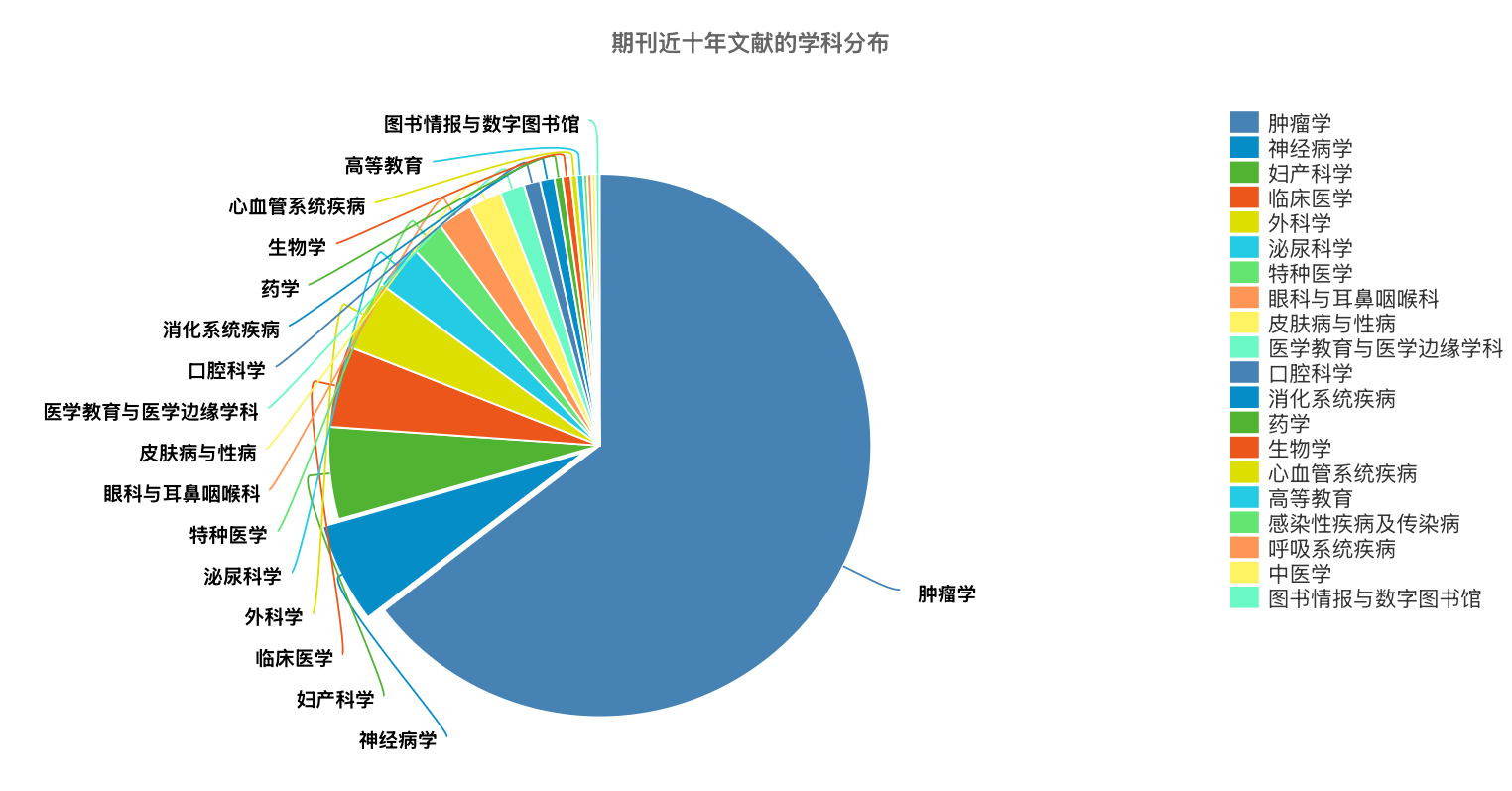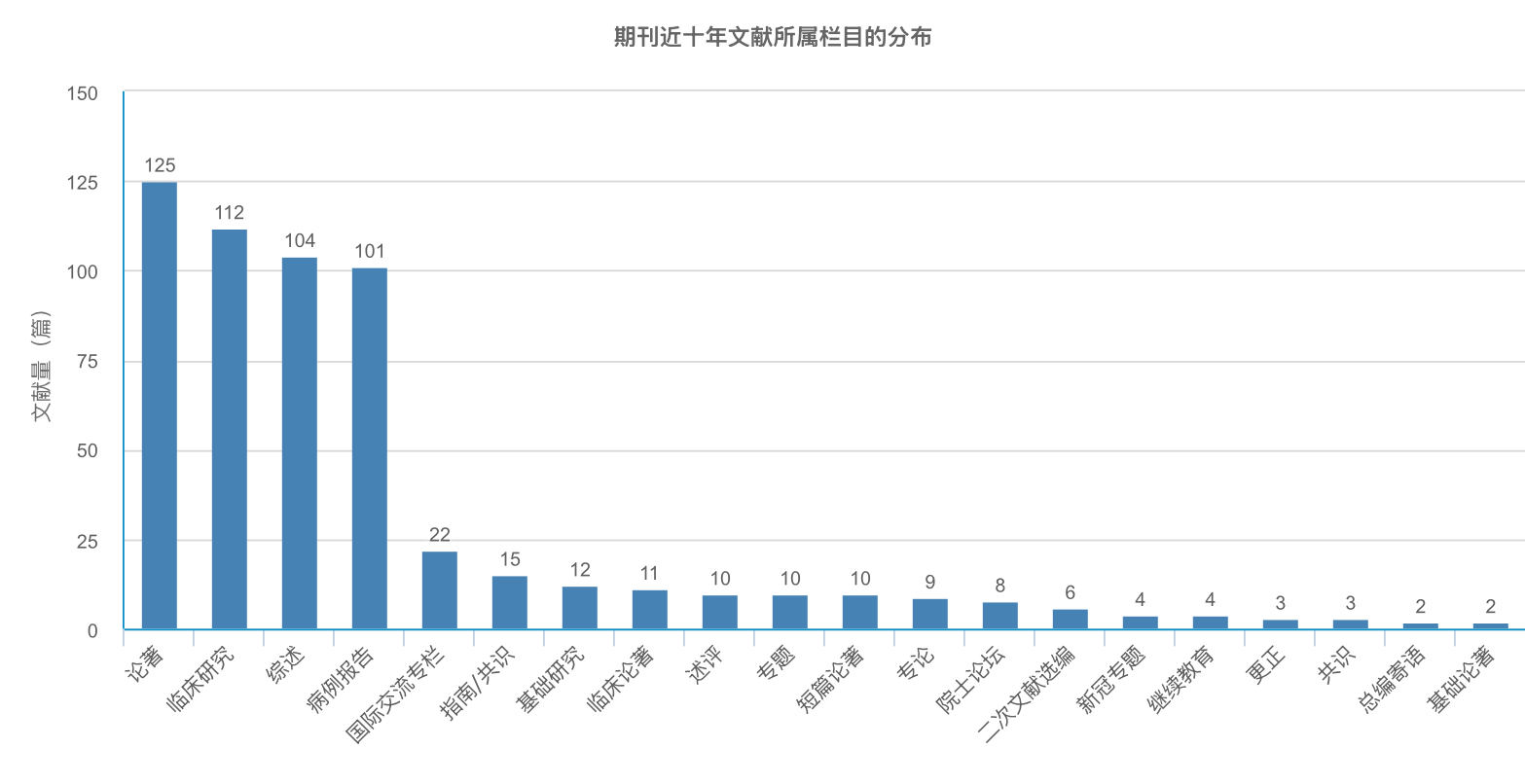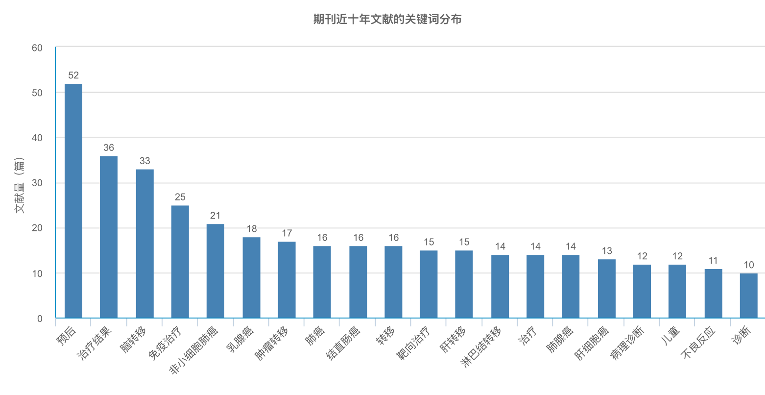 在该期刊中,"预后"栏目的发文量最高,其次是"治疗结果"、"脑转移"、"免疫治疗"、"非小细胞肺癌"等。