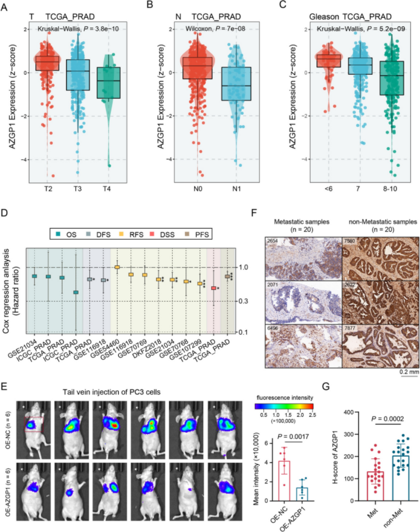第二步:多队列+临床样本验证,AZGP1低表达与前列腺癌进展、不良预后密切相关(图2) 多中心队列(TCGA-PRAD、GSE21034、DKFZ2018)验证显示,AZGP1低表达与前列腺癌高T分期、N1淋巴结转移、高Gleason评分显著相关(P均<0.05)(图2A、B、C); 生存分析显示,AZGP1低表达患者无进展生存期(PFS)显著缩短,9个bulk数据集的meta分析进一步证实AZGP1与患者预后的关联(图2D); 体内实验(裸鼠尾静脉注射、胫骨注射模型)显示,过表达AZGP1可显著降低肺转移、骨转移的荧光强度(P=0.0017、P=0.0217)(图2E); 40例临床FFPE样本免疫组化证实,转移组AZGP1的H-score显著低于非转移组(P=0.0002),明确AZGP1的临床应用价值(图2F、G)。