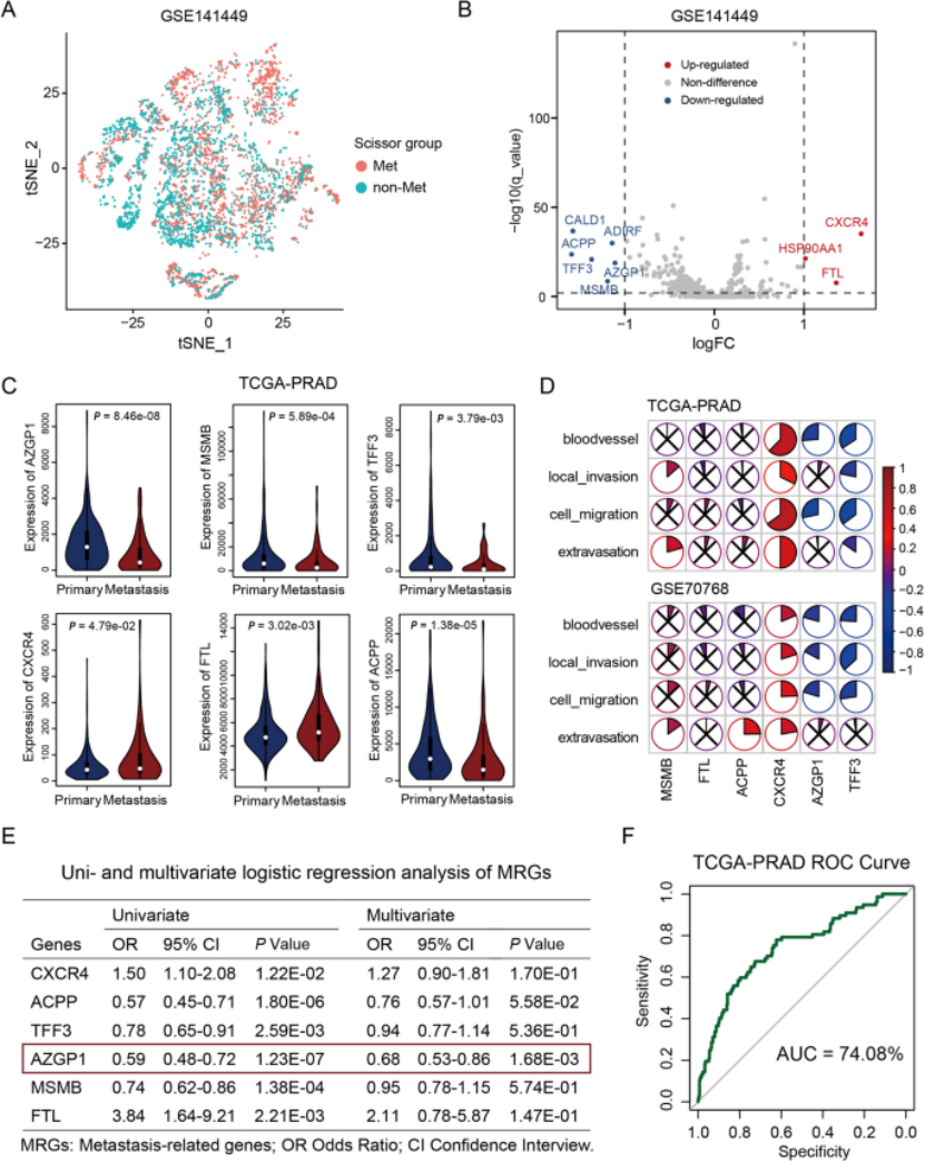 第一步:单细胞+bulk多组学联合,锁定转移相关核心基因AZGP1(图1) 研究团队先对GSE141445单细胞数据集(36424个细胞)进行预处理、细胞注释,通过Scissor工具结合bulk转录组数据(TCGA-PRAD),精准鉴定出具有转移优势的肿瘤细胞亚群(Met亚群)(图1A); 通过差异表达分析,筛选出9个转移相关候选基因,经TCGA-PRAD队列验证,最终锁定6个核心转移相关基因(MRGs),其中AZGP1与肿瘤转移呈显著负相关(图1B、C); 进一步通过单变量、多变量逻辑回归分析,建立前列腺癌转移预测模型,AUC值超70%,证实AZGP1是前列腺癌转移的独立保护因子(图1E、F); 另一个独立单细胞数据集(Tuong et al.)验证显示,Met亚群中AZGP1表达显著低于非Met亚群(P=2.289×10⁻⁷),进一步确认AZGP1的核心作用。