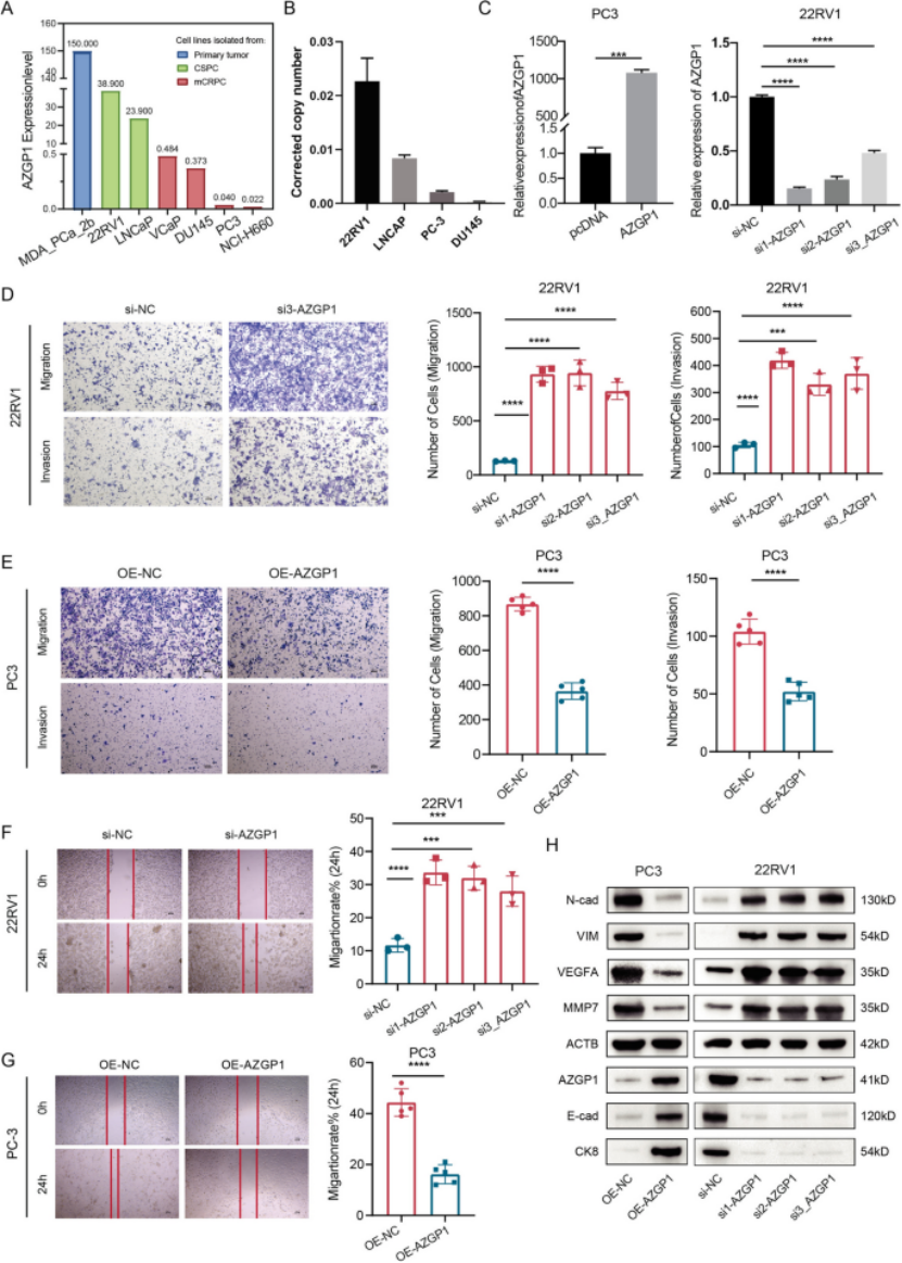 第三步:体内外功能实验,直接验证AZGP1沉默促进前列腺癌转移(图3) 细胞系验证:CCLE数据库及RT-qPCR检测显示,转移性去势抵抗性前列腺癌细胞(PC3、DU145)中AZGP1表达最低,原发性细胞(22RV1、LNCaP)中表达最高(图3A、B); 功能验证:构建AZGP1敲低(22RV1细胞)和过表达(PC3细胞)模型,Transwell实验显示,AZGP1敲低显著增强细胞迁移、侵袭能力,过表达则显著抑制(图3D、E); 伤口愈合实验进一步证实,AZGP1表达与细胞迁移能力呈负相关(P均<0.05)(图3F、G); 蛋白水平验证:Western blot显示,AZGP1敲低可上调N-钙粘蛋白、VEGFA、MMP7等转移相关蛋白表达,下调E-钙粘蛋白表达,过表达则呈相反趋势(图3H)。