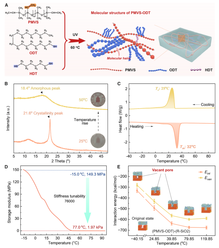 图3. PMVS-ODT的性能与粘附机理 (A) PMVS-ODT的合成路线和分子结构图。 (B) PMVS-ODT在25°C和50°C下的原位XRD图谱。 (C) 通过DSC表征的PMVS-ODT结晶与熔融曲线。 (D) PMVS-ODT的储能模量随温度的变化。 (E) 通过分子动力学模拟获得的PMVS-ODT与粗糙二氧化硅(标记为“R-SiO2”)之间的相互作用能随温度(从高温降至0°C)的变化函数。
