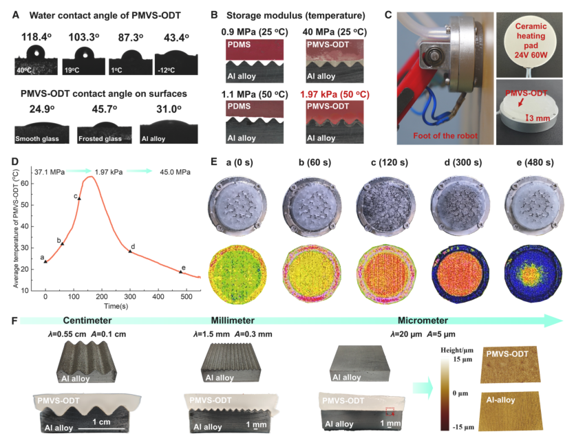 为实现与粗糙表面的共形接触,研究团队对PMVS-ODT的浸润性和模量调控能力进行了表征(图2)。结果显示,PMVS-ODT在42°C时对玻璃和铝合金等多种表面具有优异的浸润性(接触角<50°)。其储能模量在50°C时可低至1.97 kPa,远低于模量基本不变的PDMS,从而在1.2 kPa的预压力下即可完美贴合波形铝合金表面。通过在机器人足垫中集成陶瓷加热片和液体冷却通道,可实现对PMVS-ODT模量的可逆调控。加热至53.5°C使其变为透明柔软态,冷却至16.0°C后则恢复为白色刚性态,循环周期约388秒,最终实现与铝合金表面从厘米到微米尺度的近乎完美的共形接触。