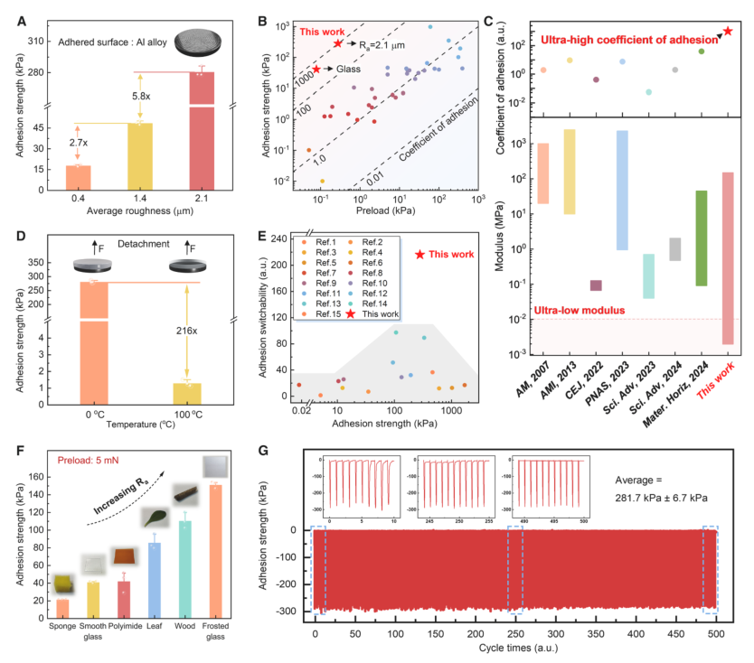 图4. PMVS-ODT的粘附性能 (A) 在5 mN预压力下,PMVS-ODT在不同粗糙度铝合金表面的粘附强度。 (B) 仿壁虎粘附剂的预压力及其对应粘附强度的比较(数据点颜色随粘附强度增加按黄、红、紫、蓝、青依次变化。对应数据列于表S1)。 (C) 刚度可调粘附剂的刚度可调范围与粘附系数的比较(数据列于表S2)。 (D) 从0°C到100°C的粘附开关特性。 (E) 粘附可切换材料的粘附强度与粘附开关比的比较(数据列于表S3)。 (F) 在5 mN预压力下,PMVS-ODT在不同基材上的粘附强度。 (G) PMVS-ODT在温度变化下,经过500次粘附循环后粘附强度的变化。