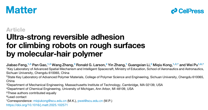 针对上述挑战,四川大学蒲伟教授、孔米秋副研究员合作,报告了一种受壁虎启发、带有“分子毛发”的支化聚合物(PMVS-ODT)粘附剂。该粘附剂通过在聚硅氧烷主链上接枝可结晶的十八硫醇侧链,实现了在粗糙表面上的超强可逆粘附。其核心优势在于:出色的表面适应性、在极低预压力(约0.3 kPa)下高达280.6 kPa的超强粘附强度、极低的脱附力(1.3 kPa),以及可定制形状的大面积制造能力。将该材料嵌入机器人足垫后,所研制的表面自适应机器人能够在从光滑到粗糙的多种垂直表面上稳定攀爬。相关论文以“Ultra-strong reversible adhesion for climbing robots on rough surfaces by molecular-hair polymer”为题,发表在Matter上,并被Nature作为研究亮点报道。