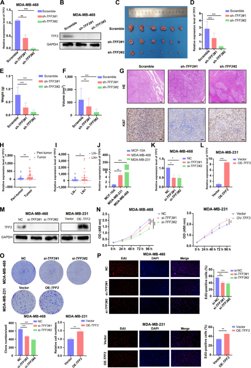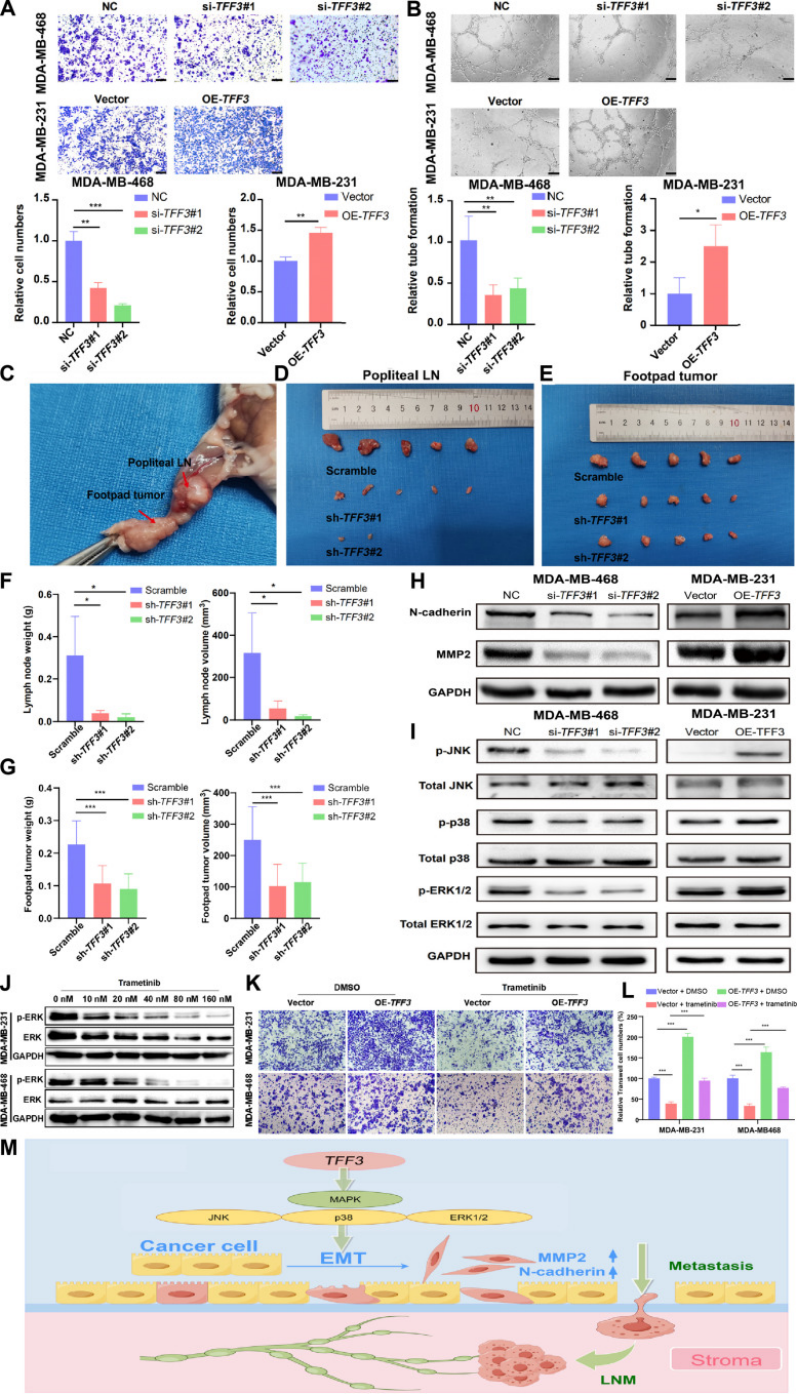 体内验证:TFF3 敲低的 MDA-MB-468 细胞裸鼠皮下移植瘤体积、重量显著降低(图 8C-E),足垫淋巴结转移模型中,TFF3 敲低抑制淋巴结转移(图 9C-G);