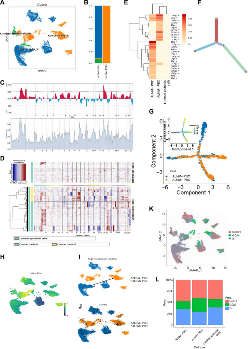 肿瘤异质性分析:ALNM + 患者肿瘤细胞 G2M 期比例升高,增殖活性增强,CNV 异常(染色体 2/16 扩增、12/17 缺失)(图 4C-D);