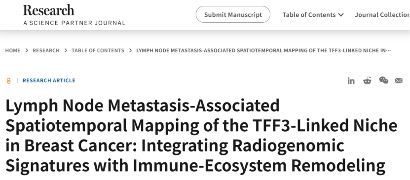 腋窝淋巴结转移(ALNM)是乳腺癌预后的“致命短板”——ALNM + 患者5 年生存率显著降低,免疫治疗响应率不足30%,临床缺乏精准预后工具和靶向方案。近日,广东省人民医院、南昌大学第三附属医院等团队联合,在《Research》(IF=10.9)发表重磅多组学研究:整合单细胞 RNA-seq、空间转录组、放射基因组学、蛋白质组等多维度数据,结合体内外功能实验,首次揭示“TFF3-MAPK-EMT 轴” 驱动乳腺癌淋巴结转移的核心机制,构建高精准放射基因组学预后模型,筛选出TFF3 靶向药物6 - 巯基嘌呤(6-MP),为乳腺癌转移分层、精准治疗提供完整解决方案!