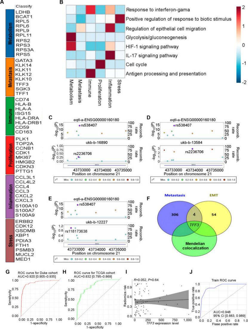 模型效能:Duke 队列训练集 AUC=0.920,TCGA 验证集 AUC=0.832;进一步整合 TFF3 的 XGBoost 模型效能更优(训练集 AUC=0.948,验证集 AUC=0.873,图 6G-J);