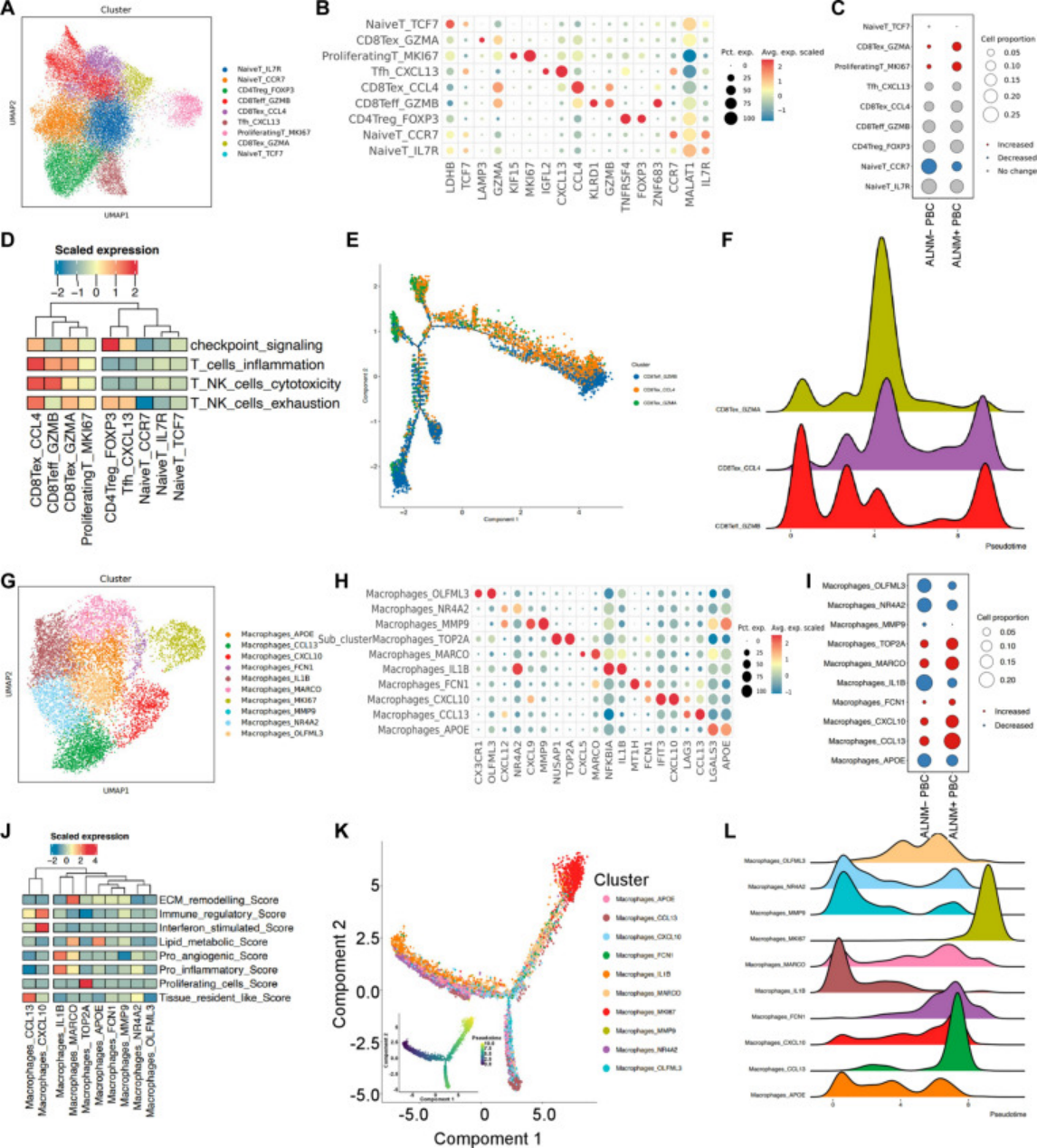 核心发现:ALNM + 患者免疫微环境呈现 3 大特征 —— 增殖型 MKI67+ T 细胞富集、耗竭型 GZMA+ CD8+ T 细胞增多、CCL13/CXCL10/TOP2A + 巨噬细胞浸润增加(图 3A-C、I);