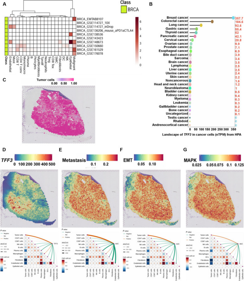 泛癌验证:TISCH 数据库显示 TFF3 在泛癌恶性细胞中高表达,乳腺癌中表达最高(图 7A-B);
