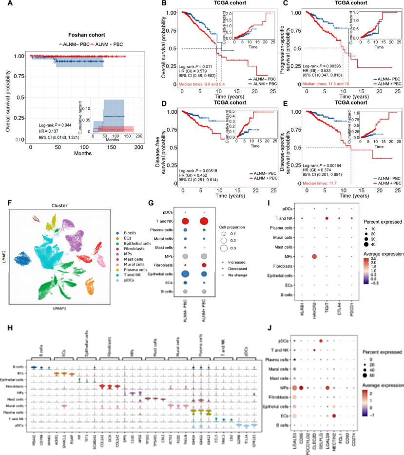 预后困境:ALNM + 乳腺癌患者总生存期、无病生存期显著缩短(TCGA + 佛山队列验证,图 2A-E),是临床预后评估的关键指标,但缺乏精准分层工具;