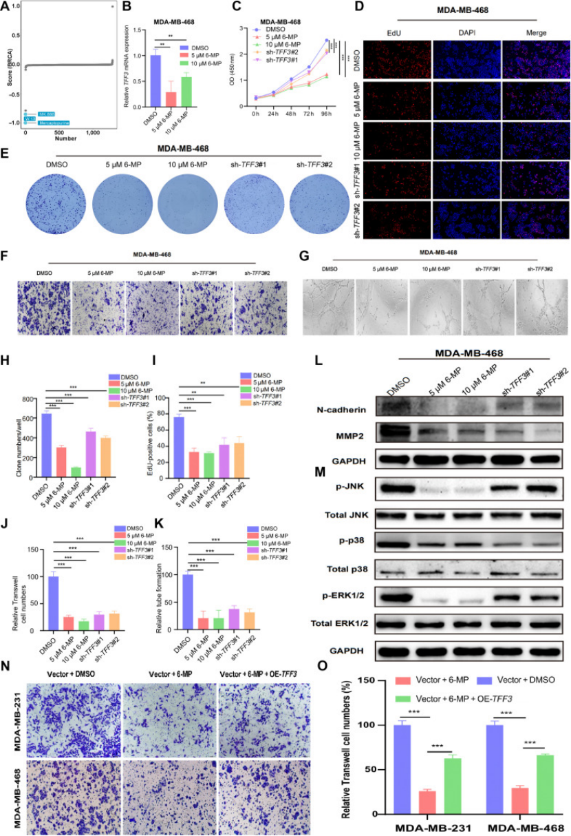 药物效能:6-MP 剂量依赖性抑制乳腺癌细胞增殖、迁移、淋巴血管生成(图 10C-G),且通过下调 TFF3 抑制 MAPK 通路激活(图 10L-M);