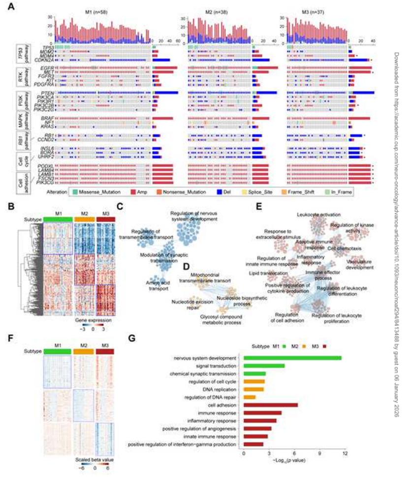 表观组特征(图2F-G):① M1 亚型低甲基化基因富集突触信号通路;② M2 富集细胞周期 / DNA 修复通路;③ M3 富集免疫应答 / 血管生成通路;