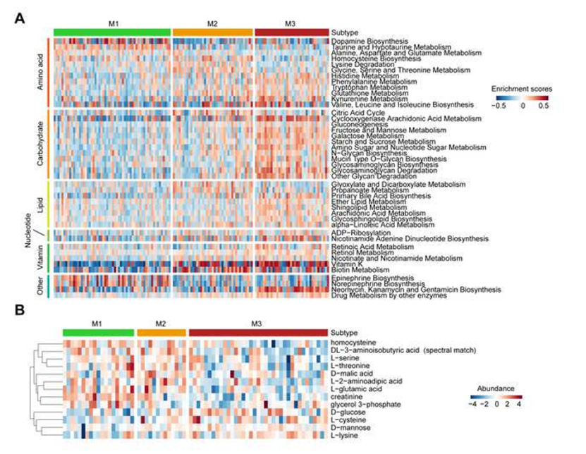代谢特征(图4):① M1:氨基酸代谢(牛磺酸 / 多巴胺生物合成)富集;② M2:线粒体代谢(三羧酸循环)、同型半胱氨酸生物合成富集;③ M3:多代谢通路激活(糖、脂、核苷酸、维生素代谢),代谢物水平证实其特征(如色氨酸 / 苯丙氨酸衍生物升高,图 4B)。