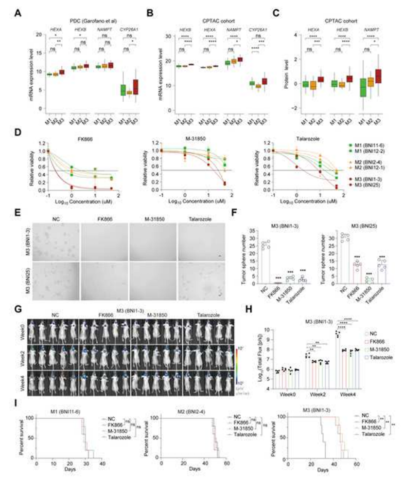 体外验证:① M3 PDC 对 3 类抑制剂 IC50 显著低于 M1/M2(图 6D);② 诱导 M3 细胞凋亡增加,球形成能力下降(图 6E-F);③ 证实靶点抑制效应(NAD + 水平降低、β- 己糖胺酶活性下降、维 A 酸浓度升高);