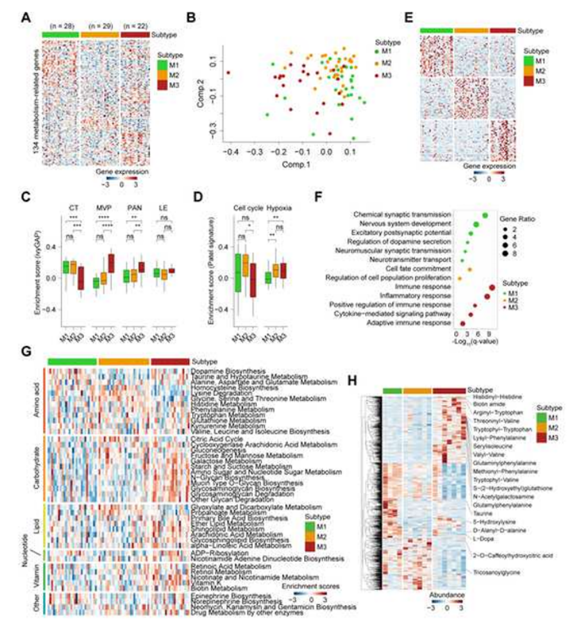 ② 预后差异:亚型预后分层显著 ——M2(线粒体代谢 + 细胞周期富集)预后最佳,M1(突触信号 + 氨基酸代谢富集)居中,M3(缺氧 + 免疫紊乱 + 多代谢通路激活)预后最差(图 1G);