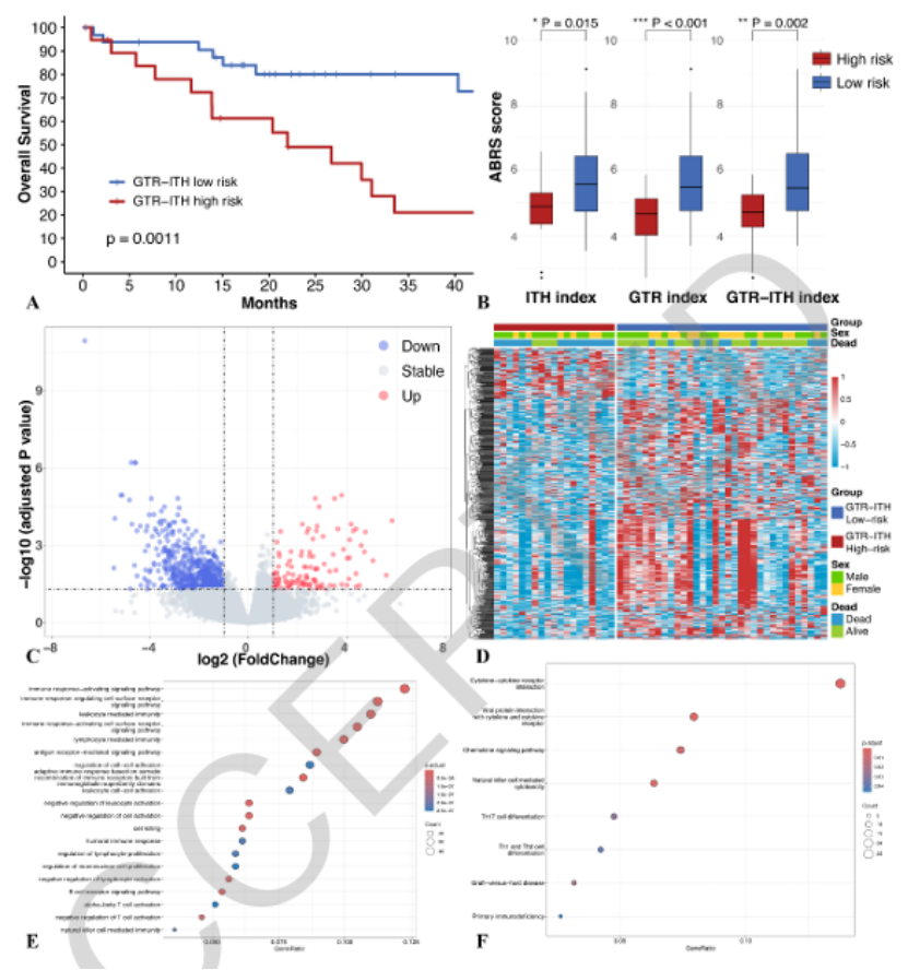 与已知生物标志物关联:GTR-ITH 评分与 ABRS 签名(ICI 响应标志物)呈中等正相关(r=0.438,P=0.001),低风险组 ABRS 评分更高(图 4B);
