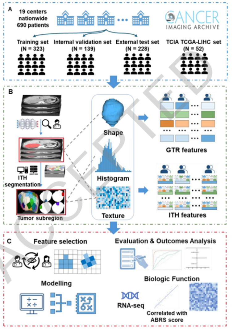 ① 基于 742 例多中心患者,开发整合全局肿瘤与异质性的 GTR-ITH 影像组学评分;