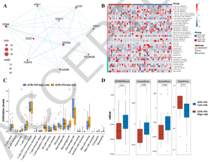 免疫微环境特征:低风险组为“免疫炎症型”—— 浆细胞和 M1 巨噬细胞浸润富集,M2 巨噬细胞减少(图 5B-C),ESTIMATE 免疫评分和基质评分升高,肿瘤纯度降低(图 5D);枢纽基因包括 CD8A、GZMB、PRF1 等细胞毒性 T 细胞相关基因(图 5A)。