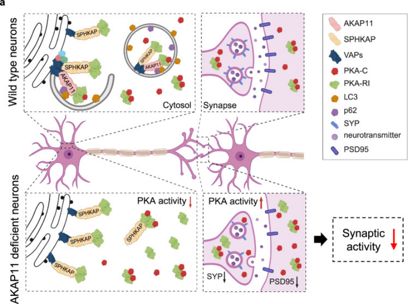 原标题:Bipolar and schizophrenia risk gene AKAP11 encodes an autophagy receptor coupling the regulation of PKA kinase network homeostasis to synaptic transmission