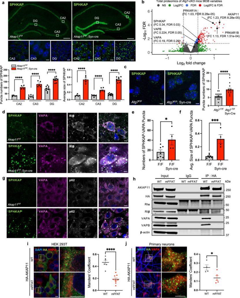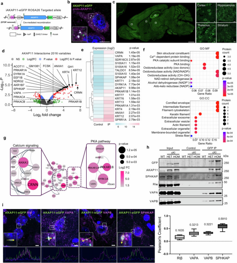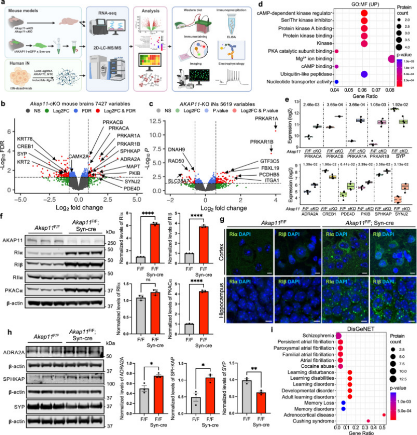 为验证这一发现,作者在AKAP11敲除小鼠前额叶皮层中,通过免疫荧光共定位证实PKA-RI在胞体堆积、PKA-RII在突触后膜富集的异常分布模式(图2C-D),与细胞模型结果完全复现,明确AKAP11的“PKA分区调控”功能是其参与疾病发生的核心靶点。