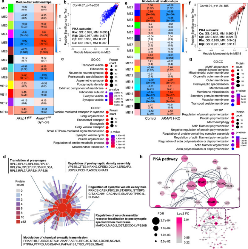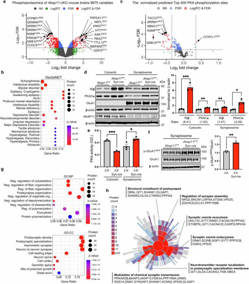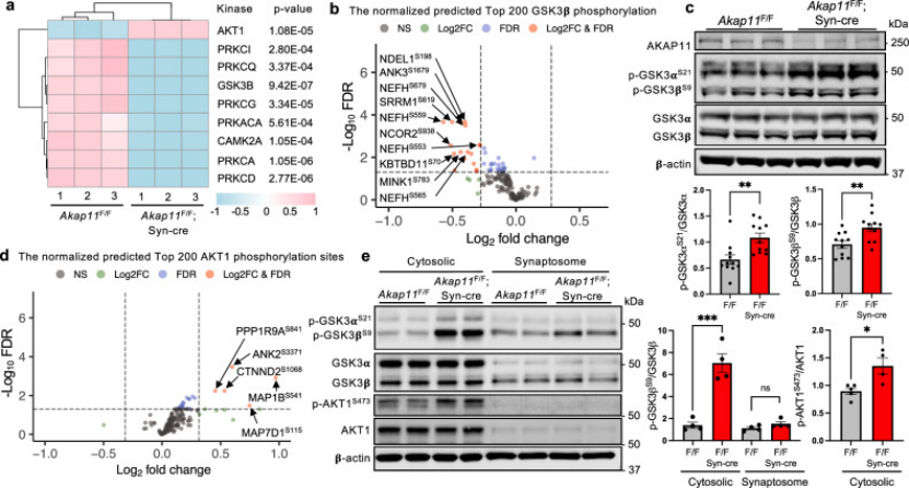 磷酸化组学破机制:用磷酸化组学分析AKAP11缺失后的激酶活性变化,发现“胞质PKA活性下降+突触PKA活性升高”的异常模式,直接关联突触功能障碍(图1核心结果),把基因变异和病理表型串起来。