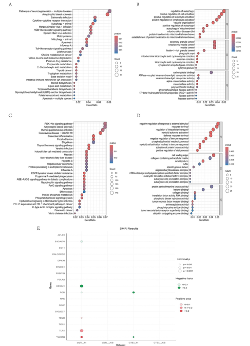 关键结果:仅TBCB显示提示性关联(nominal SMR_P < 0.05,HEIDI_P ≥ 0.05,排除异质性);通路富集分析显示,SMR筛选出的提示性基因显著富集于Toll样受体信号通路、PI3K-Akt信号通路等脓毒症核心病理通路,进一步证实TBCB的生物学相关性(图2A-E)。