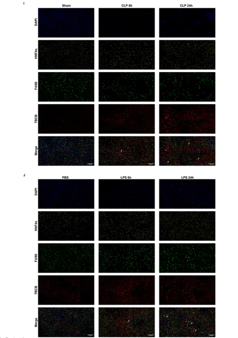 关键结果:① 病理层面:H&E染色显示,CLP和LPS模型组小鼠肝组织出现明显肝细胞气球样变、胞质空泡化及坏死,且24h损伤程度较6h更严重(图3B);② 生化层面:模型组小鼠血清ALT、AST水平显著升高,证实肝损伤发生(图3C-D);③ 蛋白层面:Western blot显示,模型组肝组织中TBCB显著上调,而APLP2、ERLEC1无明显变化(图3E-H);④ 定位层面:免疫荧光染色证实,TBCB主要在肝组织巨噬细胞中高表达(图3I-J)。