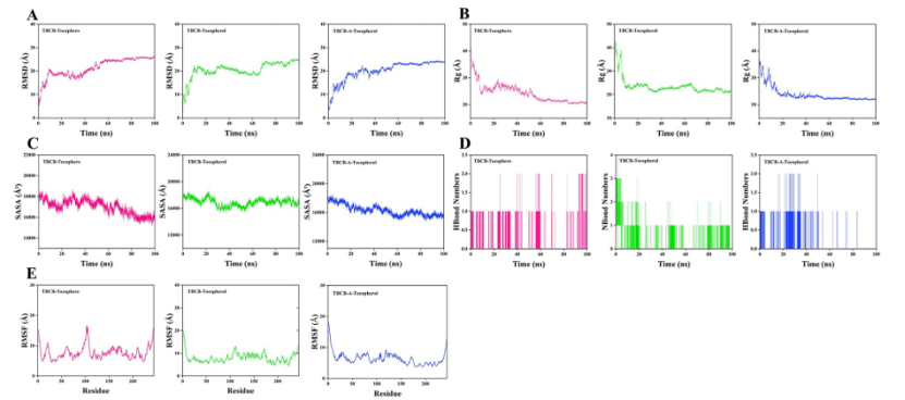 关键结果:筛选出3种tocopherol类小分子(A-tocopherol、tocophero、tocopherol),MD模拟显示,这3种小分子与TBCB形成的复合物均具有良好稳定性(RMSD在60-70 ns后趋于平稳,Rg、SASA降低并 plateau,氢键稳定,RMSF值低),提示其可能成为TBCB靶向治疗的潜在药物(图7A-E)。