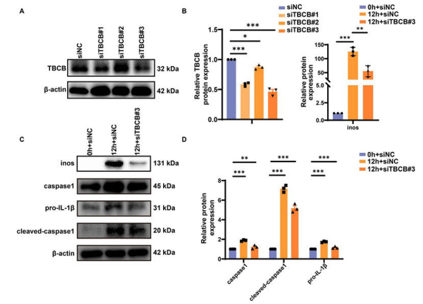 用siRNA转染BMDMs,敲低TBCB表达(筛选出siTBCB#3敲低效率最高),再用LPS+IFN-γ刺激,检测炎症标志物表达。