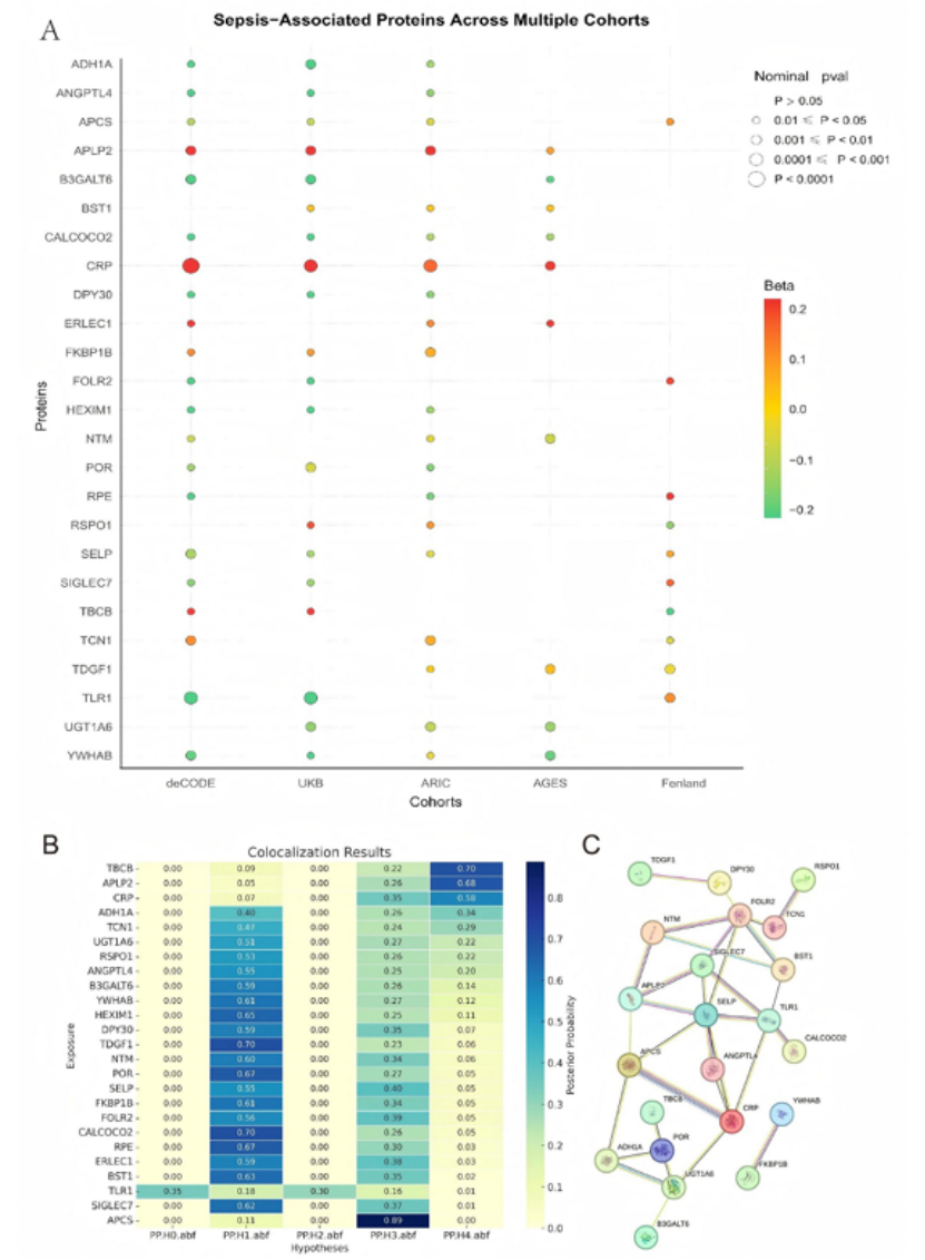关键结果:筛选出CRP、APLP2、ERLEC1、TBCB 4个与脓毒症风险呈提示性关联的蛋白( nominal P < 0.05);其中TBCB因与微管动力学密切相关(微管重塑是脓毒症器官损伤的关键机制),且colocalization分析显示其与脓毒症易感位点共享遗传信号(PPH4=0.70,中等程度共定位),被纳入后续验证;PPI网络分析显示,TBCB与APLP2处于脓毒症相关分子网络的关键节点(图1A-C)。