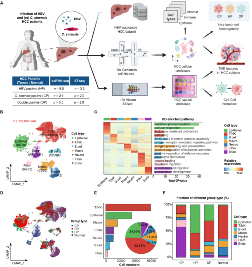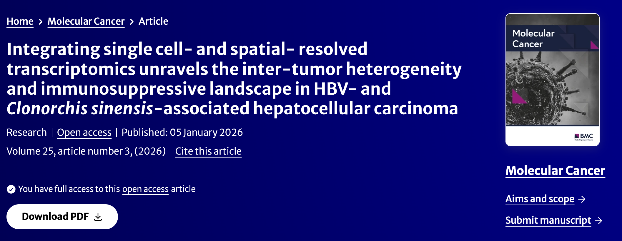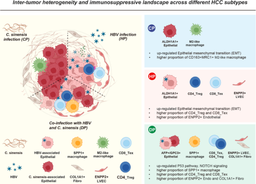 关键词:肝细胞癌、HBV、华支睾吸虫、单细胞测序、空间转录组、多组学、肿瘤异质性、肿瘤微环境、免疫抑制、预后标志物