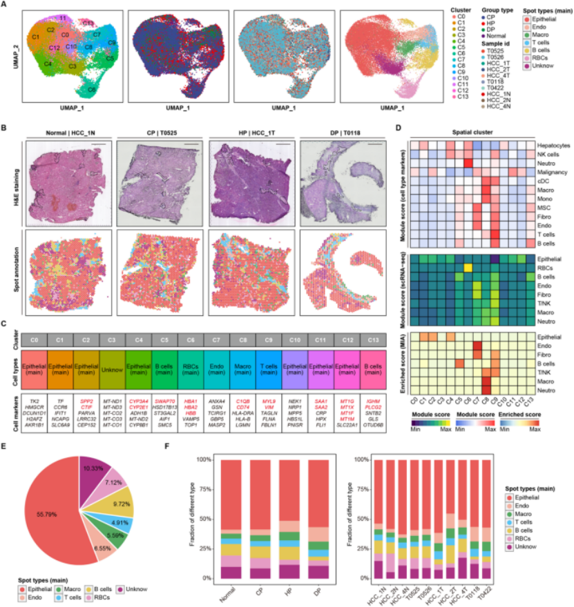 HBV与华支睾吸虫感染是肝癌高发的关键诱因,但不同感染亚型肝癌的异质性及微环境特征一直是临床科研的难点。近日,广西医科大学第一附属医院团队在《Molecular Cancer》(顶刊,IF=33.9,开放获取0版面费)发表重磅研究:整合单细胞RNA测序与空间转录组多组学技术,结合免疫荧光、IHC、体外实验等多层验证,首次系统解析CP(华支睾吸虫感染)、HP(HBV感染)、DP(双重感染)三类肝癌的异质性与免疫抑制景观(图1、8)!这篇“多组学+临床验证”的满分范本,精准示范了医生如何高效产出高分多组学论文。
