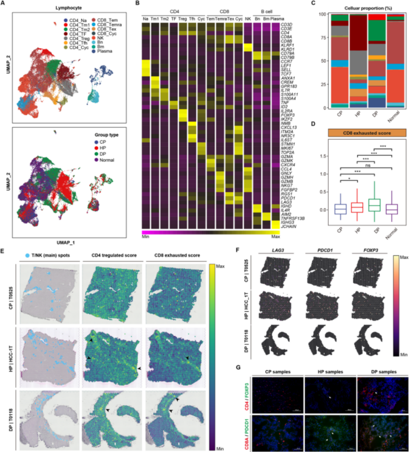 3. 免疫细胞异质性(微环境核心):① DP组富集SPP1+促癌巨噬细胞(HR=3.087,预后差,图4A-E、4G)与耗竭CD8+T细胞(高PDCD1、LAG3表达,图5D-G);② CP组以M2样巨噬细胞为主(图4C、4G);③ HP组CD8+耗竭T细胞与CD4+Treg比例升高(图5C);