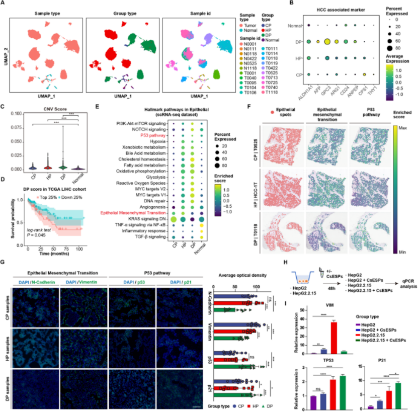 2. 肿瘤细胞异质性(核心科学问题):DP组肿瘤细胞恶性度最高——高表达AFP、GPC3等癌标,CNV评分显著升高(含9+/10+/22+染色体重复),p53/NOTCH通路激活(图3B-E、3G);