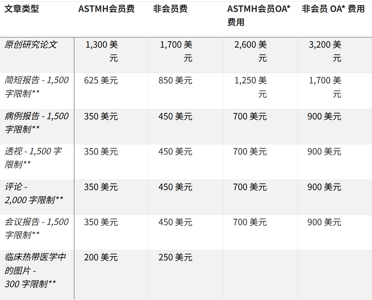 出版费基于稿件类型,作为会员的通讯作者将继续享受这些费用以及开放获取 (OA) 费用的折扣。以下为期刊官网发布的2025年最新AJTMH 出版费: