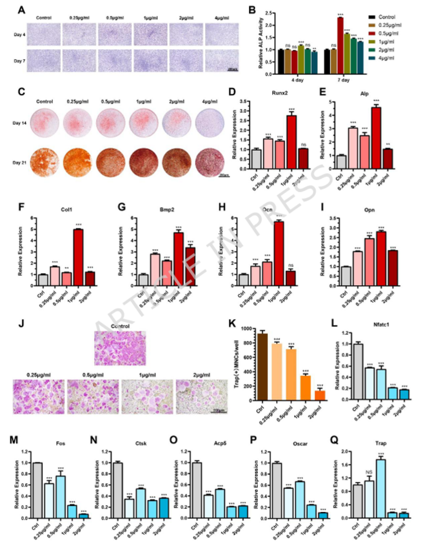 发文关键:体外实验聚焦“生物相容性 + 核心功能”,先明确安全浓度,再验证 “促骨再生 + 抑骨吸收” 双效,数据层层递进;