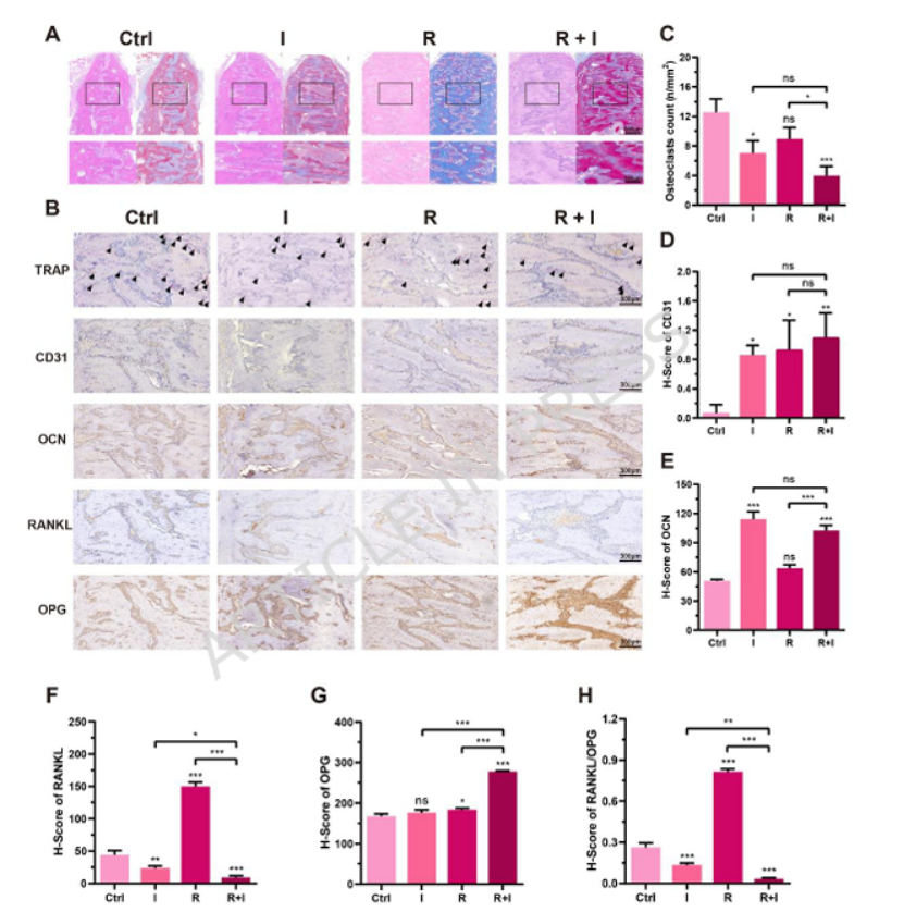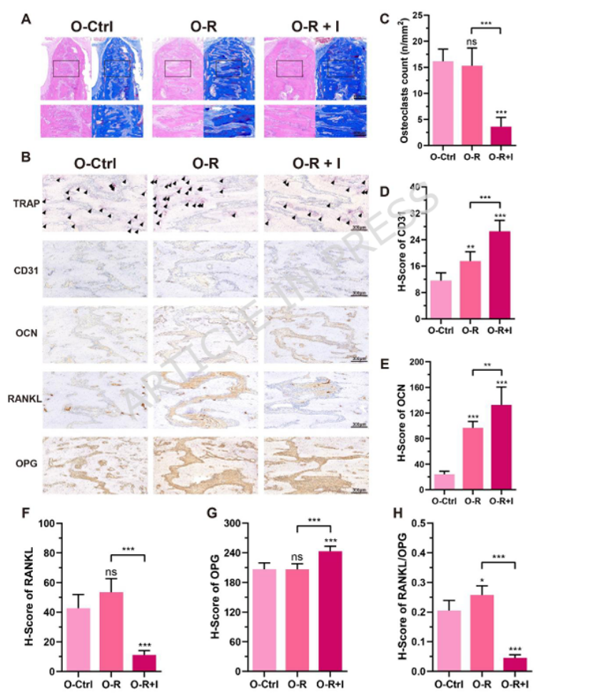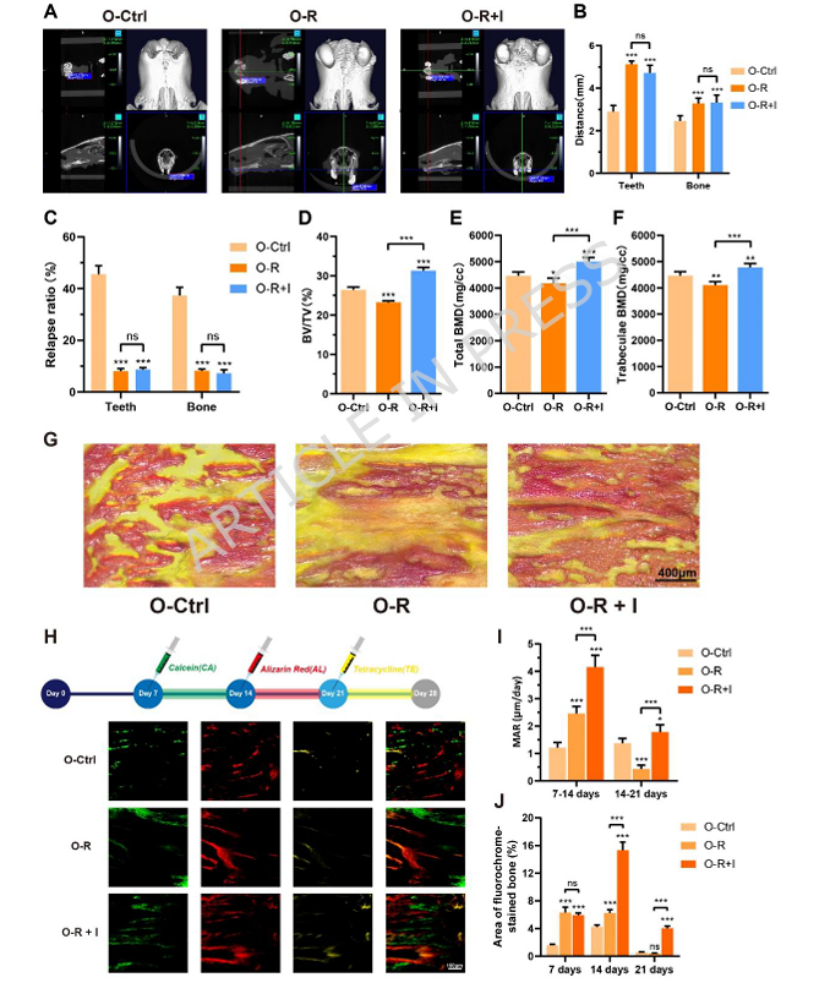 正常牵张模型:CePB 原位注射组(I/R+I)的骨体积分数(BV/TV)、骨密度(BMD)显著高于对照组(图 5D-F),矿化沉积率提升(图 5I-J),TRAP 阳性破骨细胞减少(图 6C);