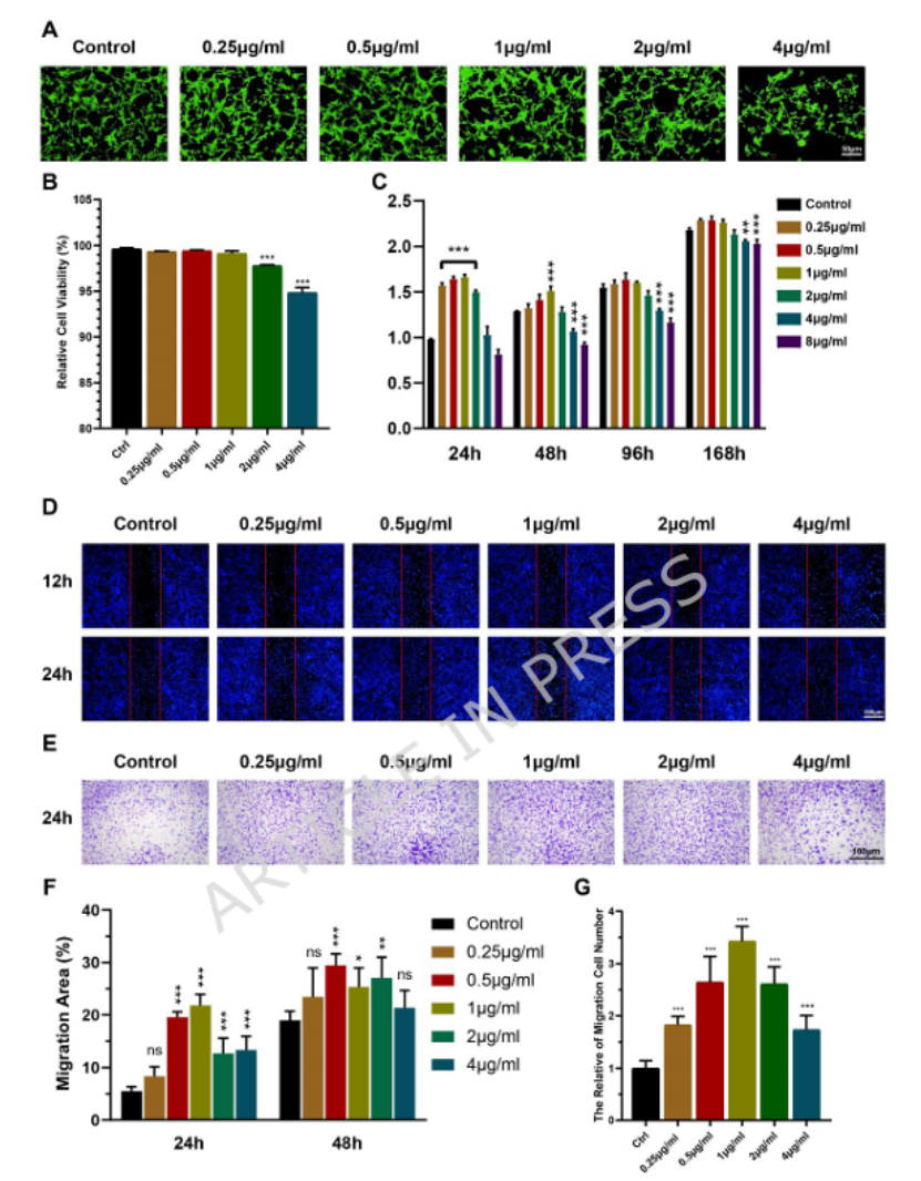 顶刊加分点:明确“1μg/mL” 最佳浓度,为体内实验提供依据,功能验证覆盖 “细胞增殖 - 迁移 - 分化” 全流程,数据完整。