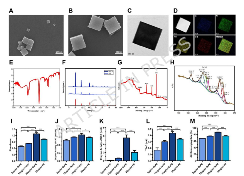 核心表征:CePB 保持普鲁士蓝立方结构,成功掺杂 Ce 元素(EDS/TEM 验证,图 1C-D),Ce³⁺/Ce⁴⁺价态转换增强酶活性(XPS 验证,图 1G-H);