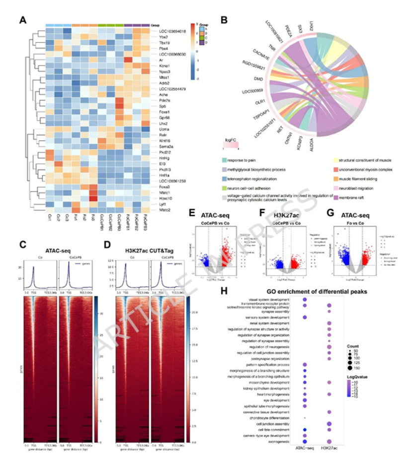 差异分析:CoCePB 组 vs Co 组有 2450 个 ATAC-seq 差异开放峰、2396 个 H3K27ac 差异修饰峰,富集于 “间充质发育、细胞命运决定” 通路(图 10E-H);