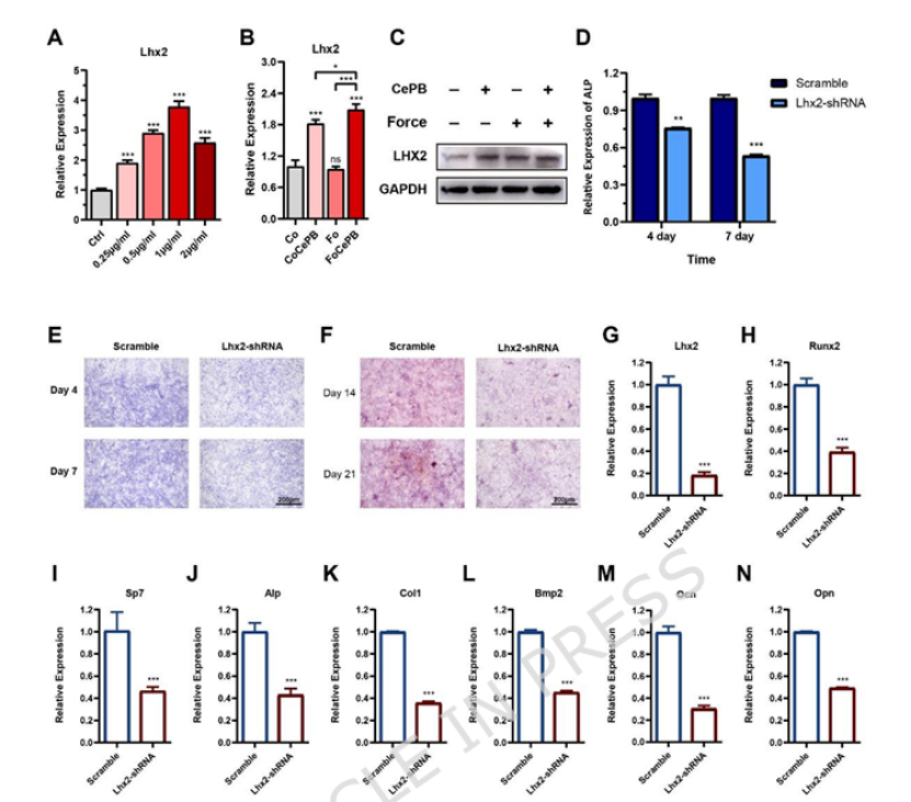 体外机械张力模型:采用 Flexcell 系统施加 10% 拉伸应变(0.5Hz,8h / 天),FoCePB 组(机械张力 + CePB)的 ALP 活性、 osteogenic 基因(Alp、Bmp2 等)表达显著高于单独 Fo 组或 CoCePB 组(图 9B-J);
